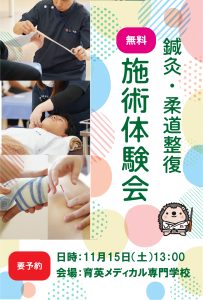 申込受付中! 11/15(土)鍼灸・柔道整復 施術体験会開催 11/15(土)13:00~ -プロの“施術”を体験しよう- 患者役になって施術を受けながら、 鍼灸・柔道整復の魅力を体感できるイベントです🙌 11月15日(土)13:00〜 育英メディカル専門学校 参加無料・要予約 お申し込み 一覧に戻る