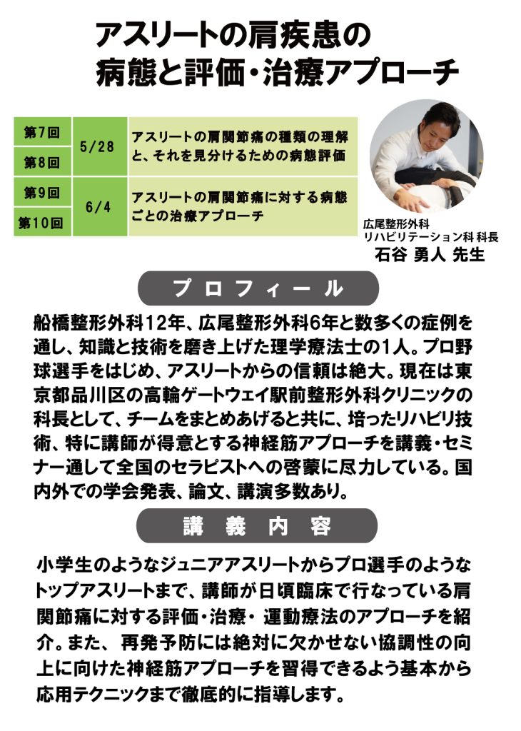 Cコース:アスリートの肩疾患の病態と評価・治療アプローチ(全4回)/石谷 勇人 先生