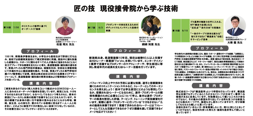 Eコース:匠の技 現役の接骨院の技術伝承(全3回)/佐復 翔太 先生・纐纈 知里 先生・大柴 龍 先生