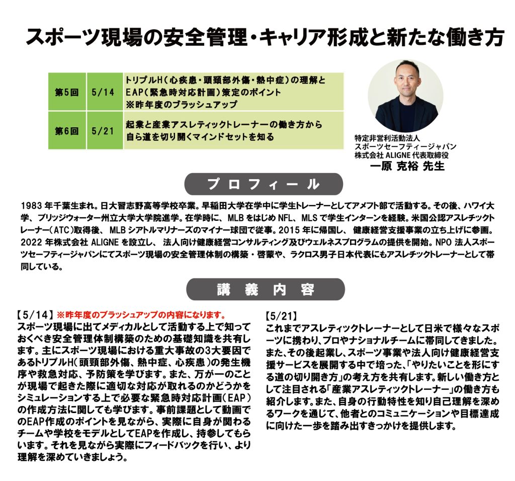 Bコース:スポーツ現場の安全管理・キャリア形成と新たな働き方(全2回)/一原 克裕 先生
