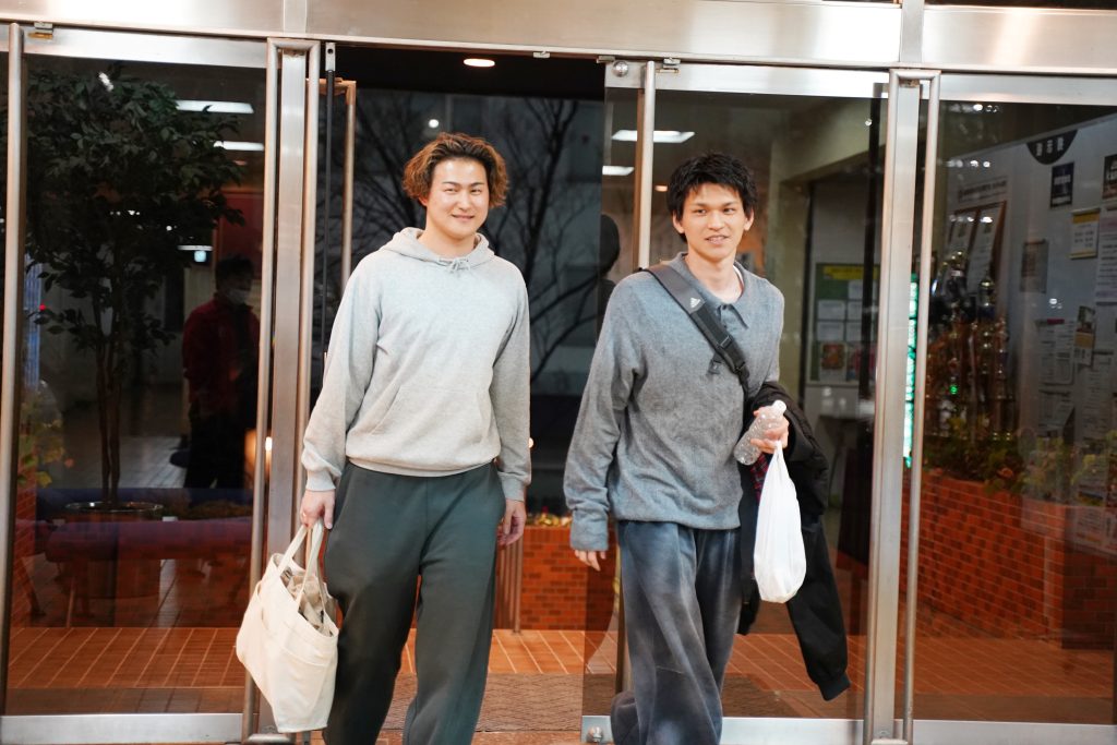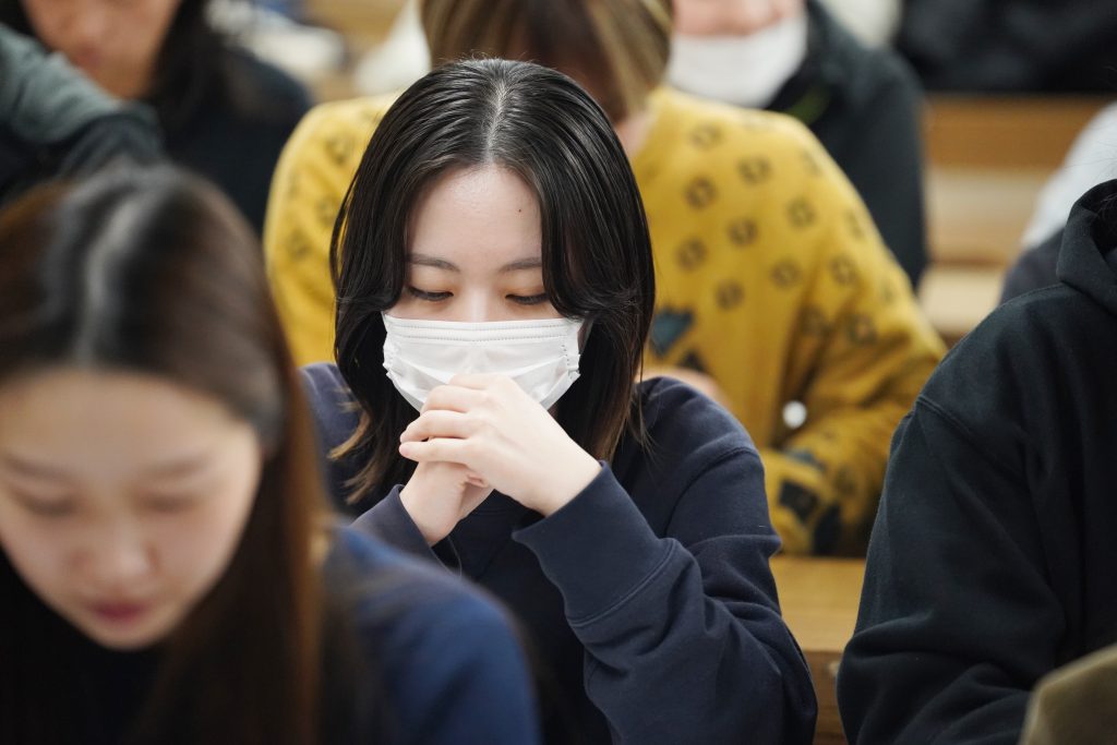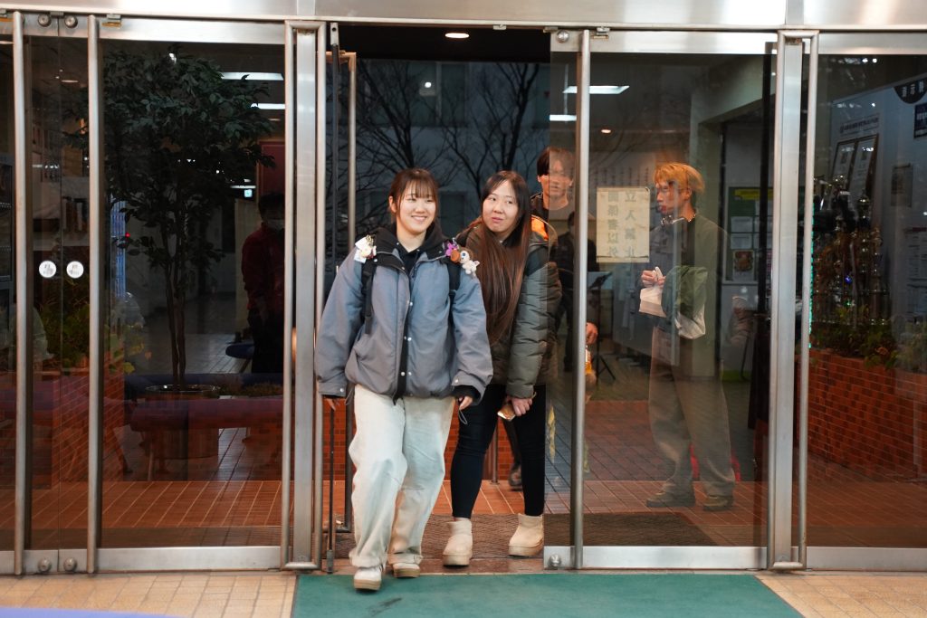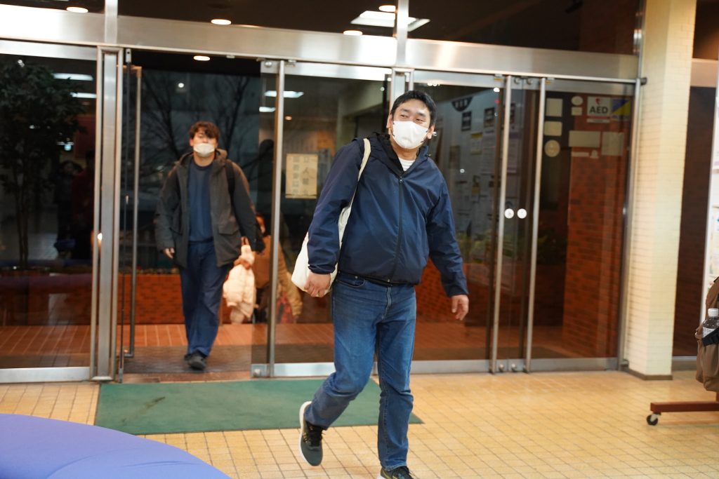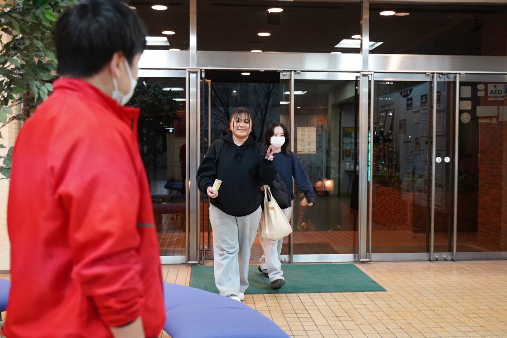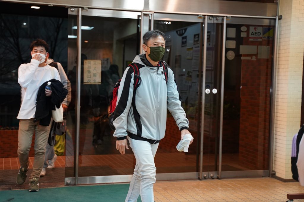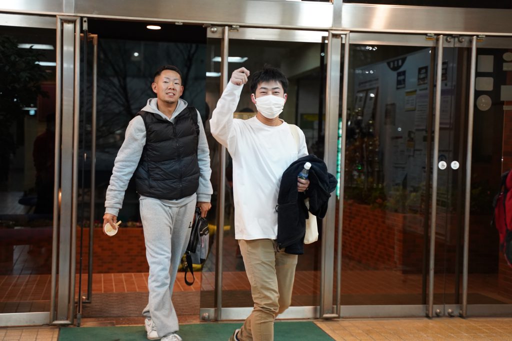 試験会場から戻ってきた学生たち。