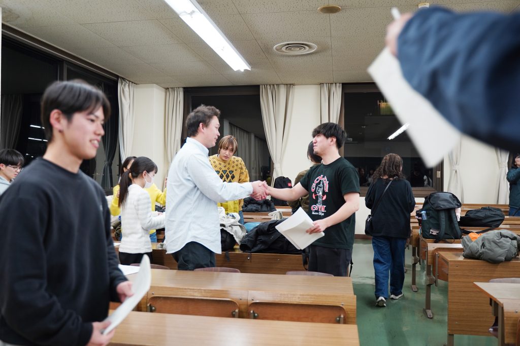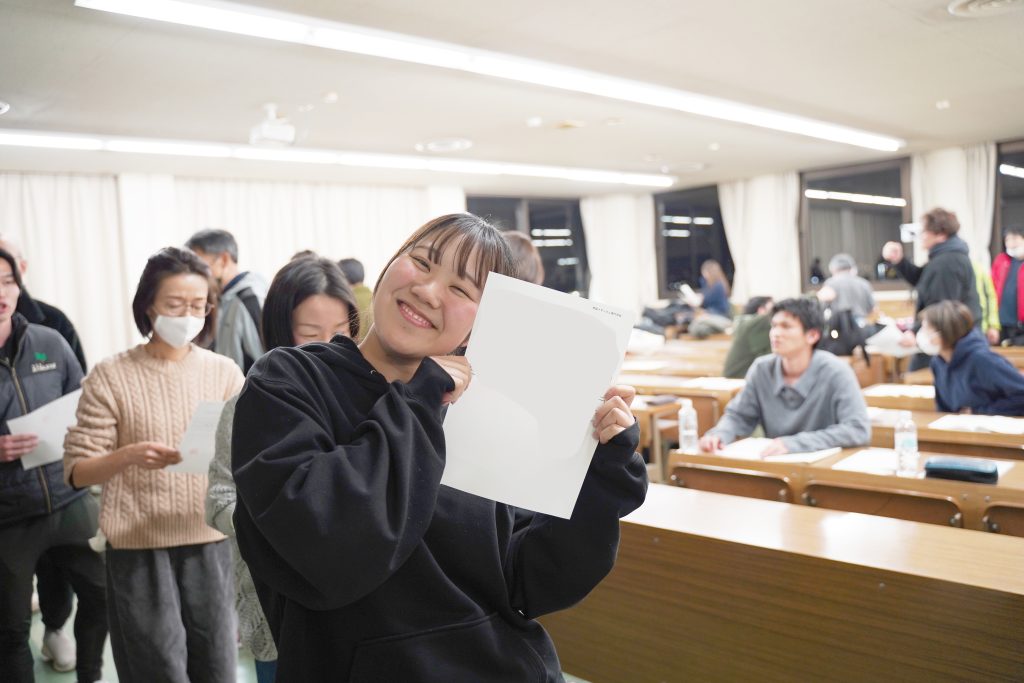 ひとりひとりが学科長から自己採点の個票を受け取り、結果を確認。